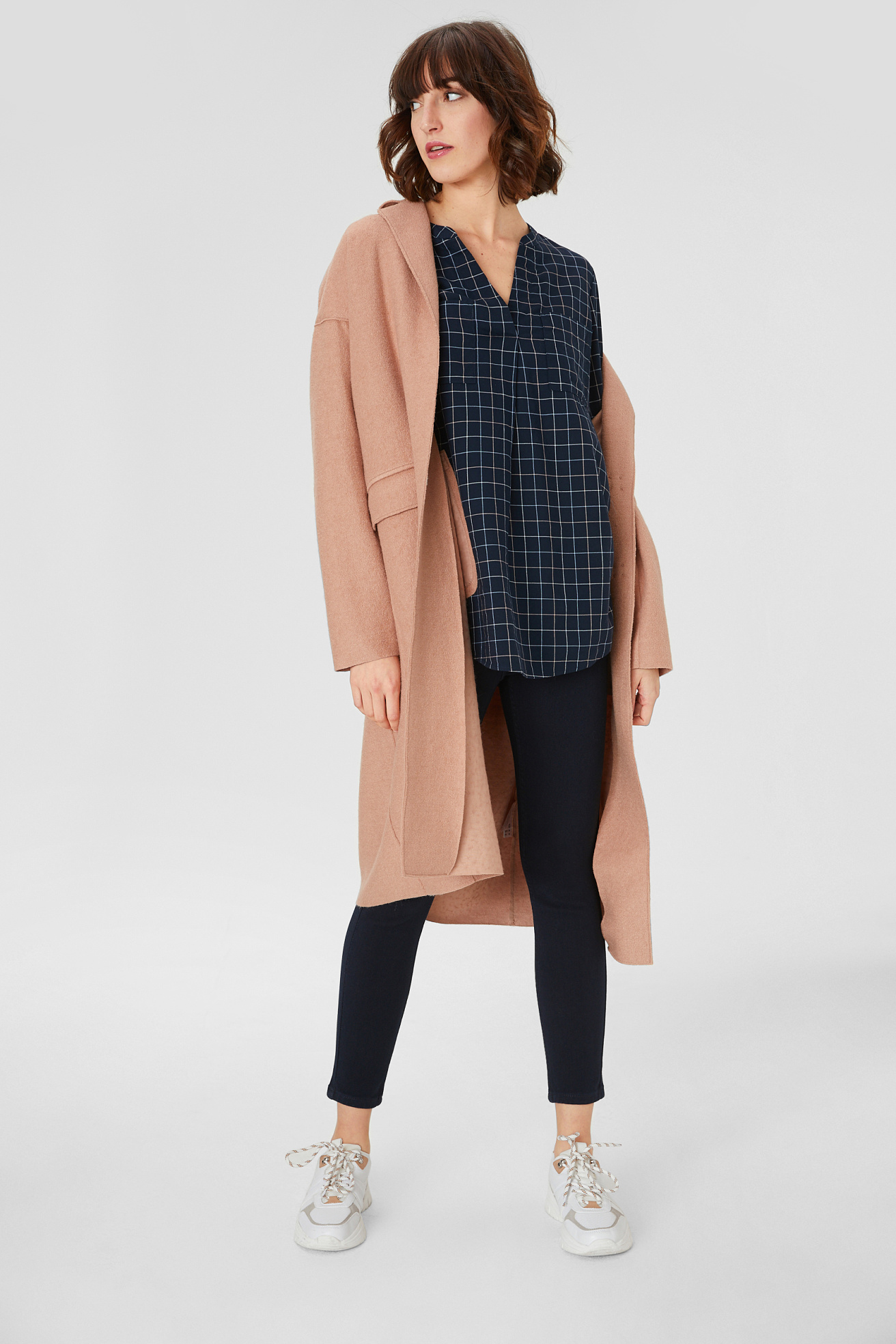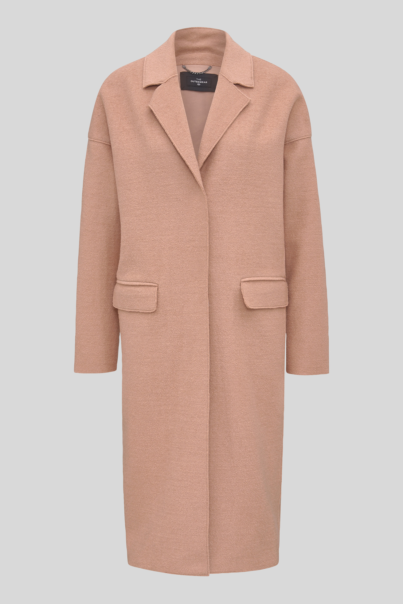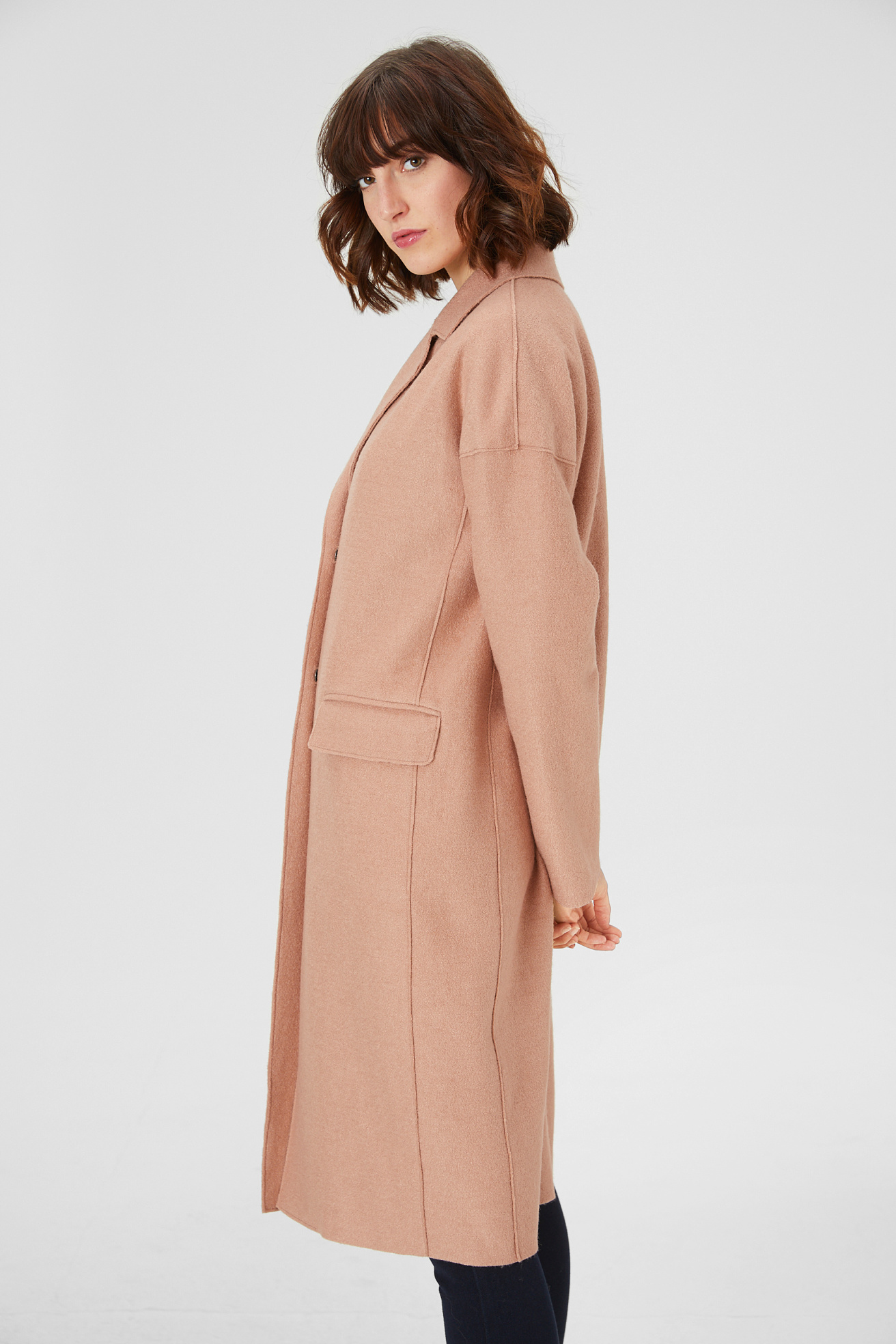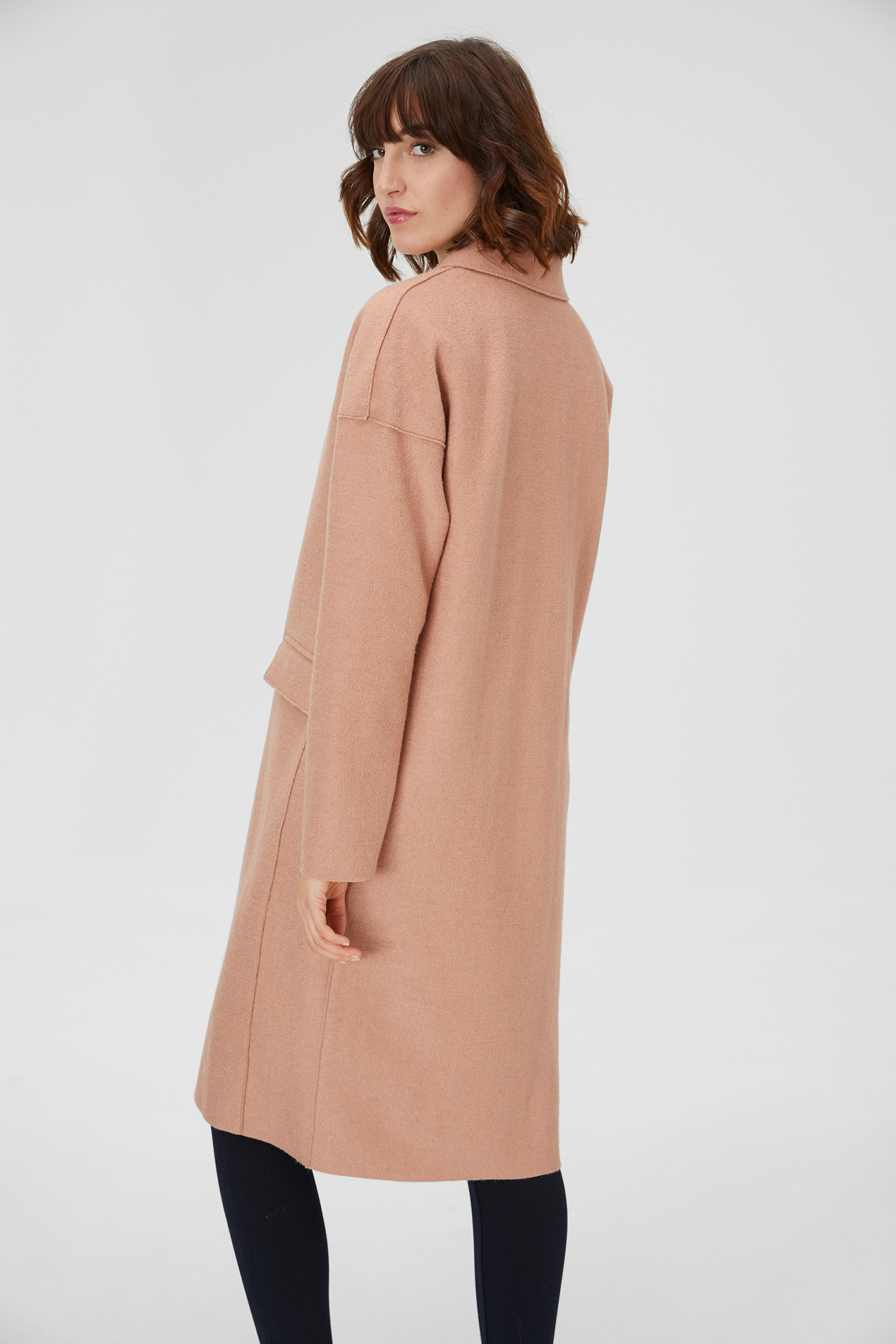 Los hombros caídos y los dos bolsillo de tapeta aportan un toque desenfado al diseño de este abrigo